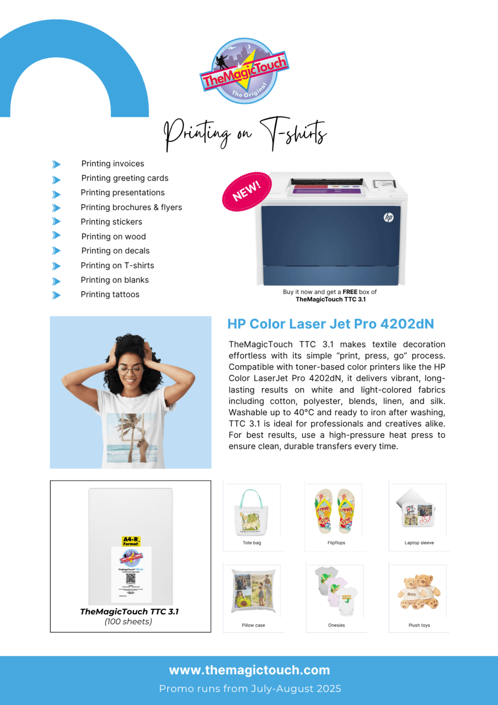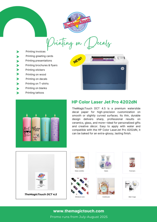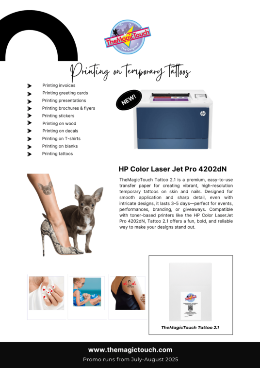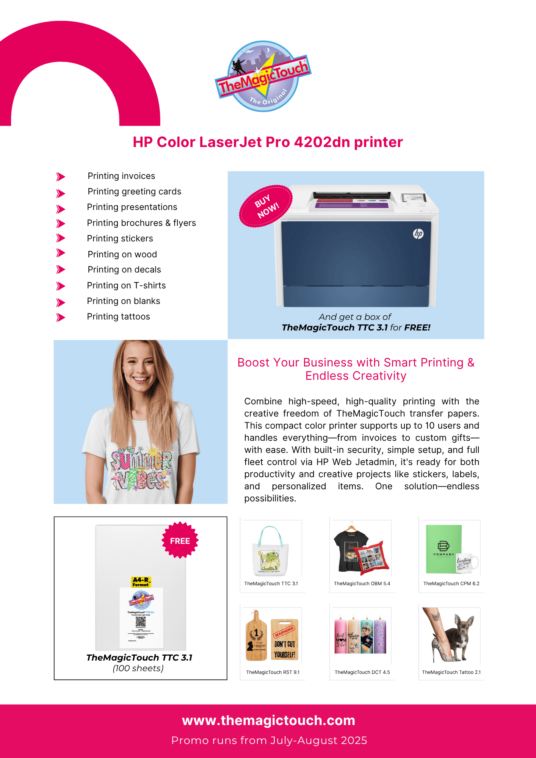 Unleash your creativity with the HP color Laserjet Pro 4202! This perfect entry-level printer for CMYK applications comes with a free box of transfer paper, allowing you to explore its full potential.